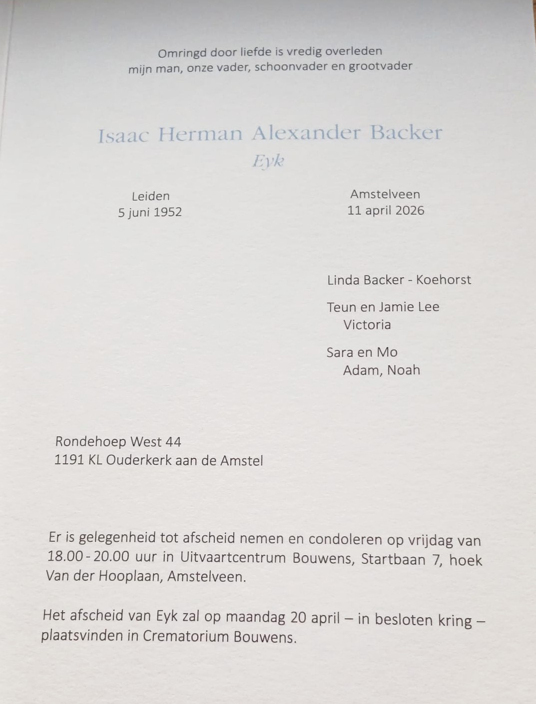 Op 11 april j.l. is Eyk Backer na een korte ziekteperiode op 73 jarige leeftijd in het ziekenhuis in Amstelveen overleden.